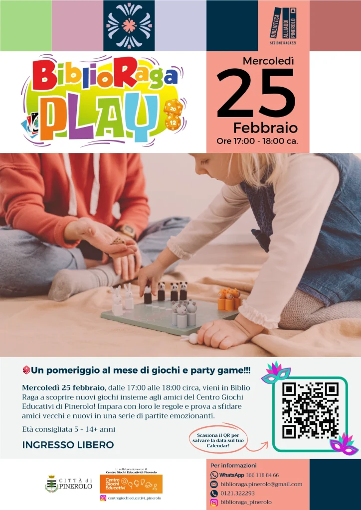 Mercoledì 25 febbraio, dalle 17:00 alle 18:00 circa, vieni in Biblio Raga a scoprire nuovi giochi insieme agli amici del Centro Giochi Educativi di Pinerolo! Impara con loro le regole e prova a sfidare amici vecchi e nuovi in una serie di partite emozionanti.
